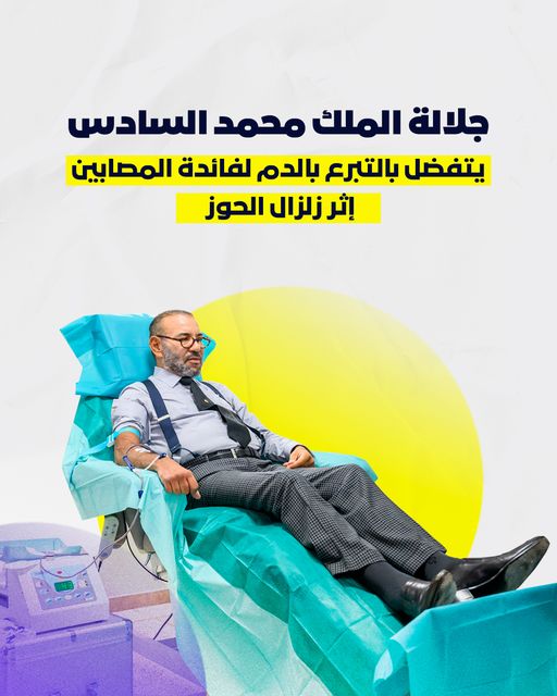 تفضل صاحب الجلالة الملك محمد السادس بالتبرع بالدم، كالتفاتة كريمة من جلالته تجسد العناية الملكية السامية وتعبر عن تضامن جلالته الكامل وعطفه على الضحايا والعائلات المكلومة، إثر زلزال الحوز.