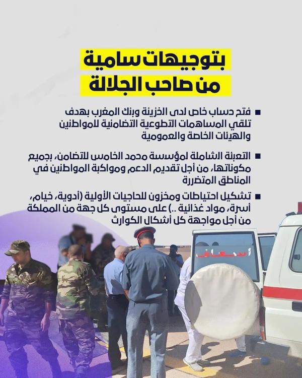 أعطى جلالة الملك محمد السادس، نصره الله، تعليماته السامية لتعزيز ﻓرق اﻟﺑﺣث واﻹﻧﻘﺎذ لتسريع عملية إجلاء اﻟﺟرﺣﻰ، وم،