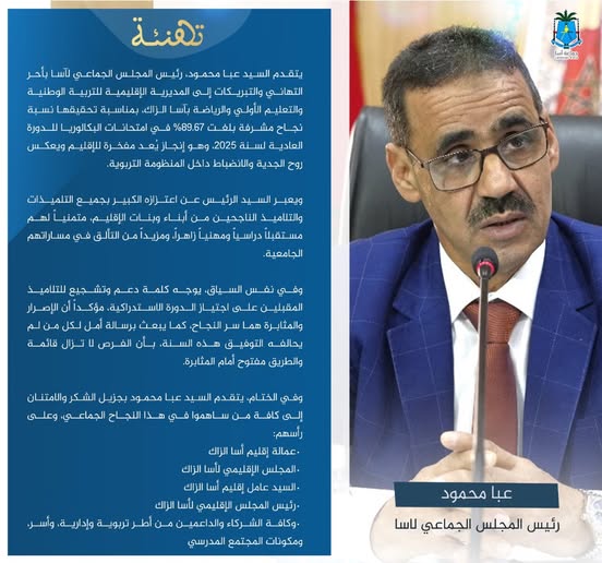 إنجاز مشرف لآسا الزاك في البكالوريا 2025 : تهنئة خاصة من السيد عبا محمود رئيس المجلس الجماعي لأسا