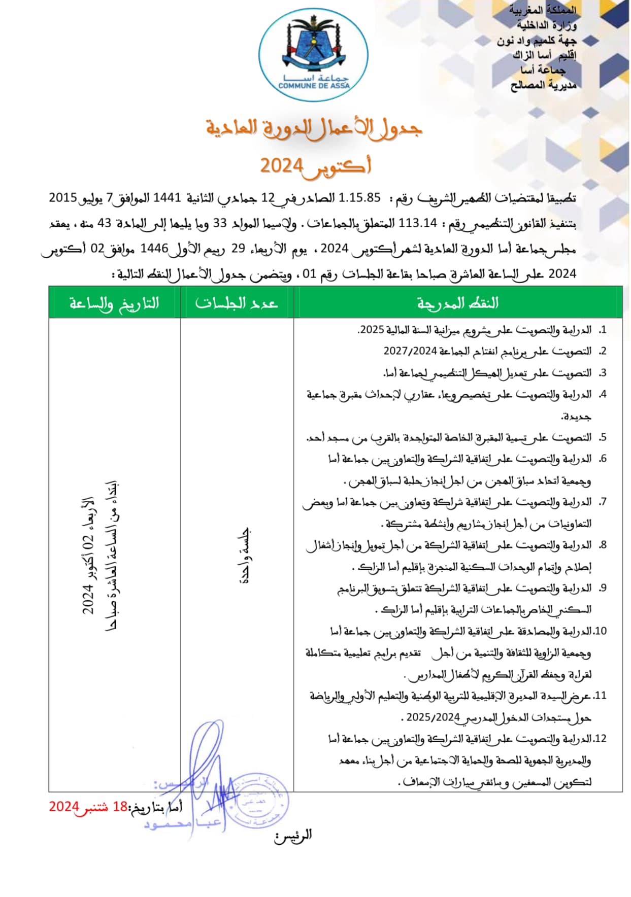 تطبيقا للمادة 28 من القانون التنظيمي رقم 14-113 المتعلق بالجماعات، و بناءا على مراسلة السيد رئيس المجلس الجماعي لأسا السيد محمود عبا بشأن إحالة مواضيع جدول أعمال الدورة العادية للمجلس الجماعي لأسا المقرر عقدها بتاريخ 02 اكتوبر 2024
