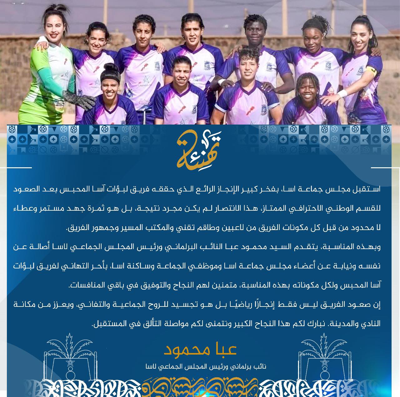 تهنئة بمناسبة صعود فريق لبؤات آسا المحبس للقسم الوطني الاحترافي الممتاز