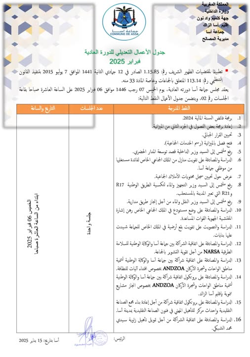 جدول الأعمال التعديلي للدورة العادية لمجلس جماعة أسا المنعقد 06 فبراير 2025